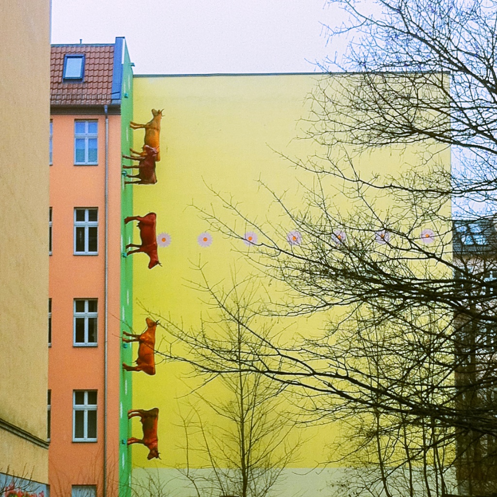 Im Bötzowviertel allerdings ist eine kleine Revolution passiert: Aus einer wuchtig-öden Mauer wurde eine grüne Weide mit hübschen Blumen, auf der jetzt senkrecht Kühe grasen. Alles strahlt bunte Leichtigkeit aus. Darf eine ernst gemeinte Mauer so aussehen? Der Berliner an sich wäre da wohl eher skeptisch, mir aber gefällt diese Weide.