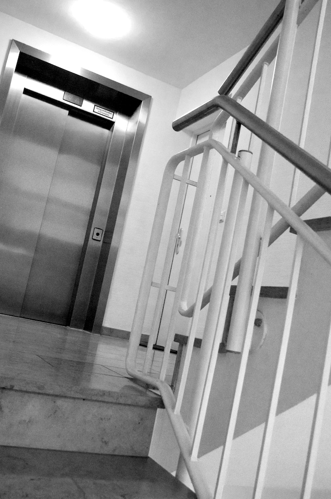 Fahlgelb mit dickbäuchigen Balkonen klotzt ein Eckneubau am Kollwitzplatz. Hier wohnt man. Für Prenzlberg-Verhältnisse durchaus für eine angemessene Miete, und das gab seinerzeit den Ausschlag. Begibt man sich hinein, ins Treppenhaus, schlägt einem ein spießig-sauberer Geruch entgegen. Hier rieche es richtig deutsch, pflegen unsere dänischen Gäste zu bemerken. Es riecht nach Ordnung und Regelmäßigkeit. Hier gibt es keine Exzesse, kein Graffiti, keine Schmierereien. Nur die verglaste Anschlagtafel der Hausverwaltung sowie an den Fahrstuhltüren geklebte Warnhinweise, dass der Aufzug im Brandfall nicht benutzt werden dürfe, verleihen dem Treppenhaus einen gewissen grafischen Schwung. Ob sich auch Menschen, allen voran die Bewohner dieses Hauses darin bewegen, ist schwer zu sagen. Die Bewohner sind nämlich geradezu gespenstisch unsichtbar. Ab und zu huscht ein unbekannter Jemand an einem vorüber mit einem Hallo, kaum sieht man diesen Jemand jemals wieder. Manchmal werden ein paar Worte gewechselt, ob man mit in den Aufzug möchte oder lieber nicht. Bis in die zweite Etage ist es nicht weit, daher habe ich die Gespenster bisher allein in ihre höher liegenden Ebenen fahren lassen. Vielleicht sollte ich es in Zukunft mal versuchen, die fünf Sekunden Zwangsgemeinschaft im Fahrstuhl zwischen Erdgeschoss und zweitem Stock mit so einem Gespenst auszukosten. Vielleicht entfährt ihm ja das eine oder andere Wort mehr. Vielleicht erfährt man, wo im Hause es sich zu verkriechen gedenkt.